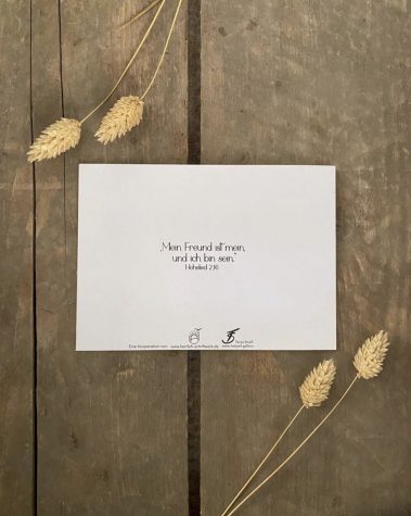 Bei zwei der Karten sind die zugehörigen Bibelstellen auf der Rückseite aufgedruckt. Innen sind die Karten weiß. Sie kommen mit passenden Umschlägen aus Kraftpapier.
