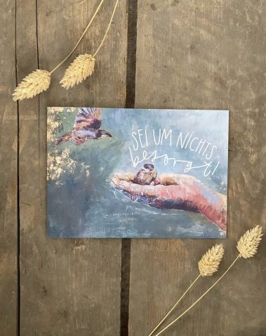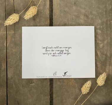 Klappkarte „Sei um nichts besorgt“ erinnert daran, dass Gott unser Versorger ist. Auf der Rückseite findest du die Bibelstelle aus Matthäus 6,34.